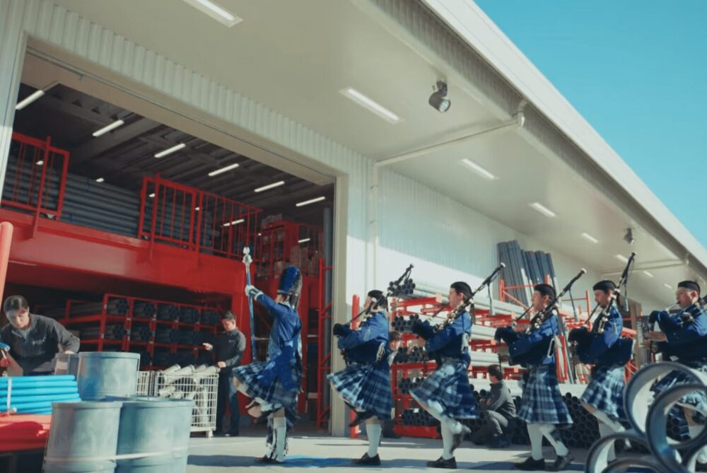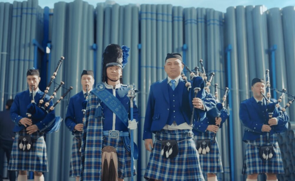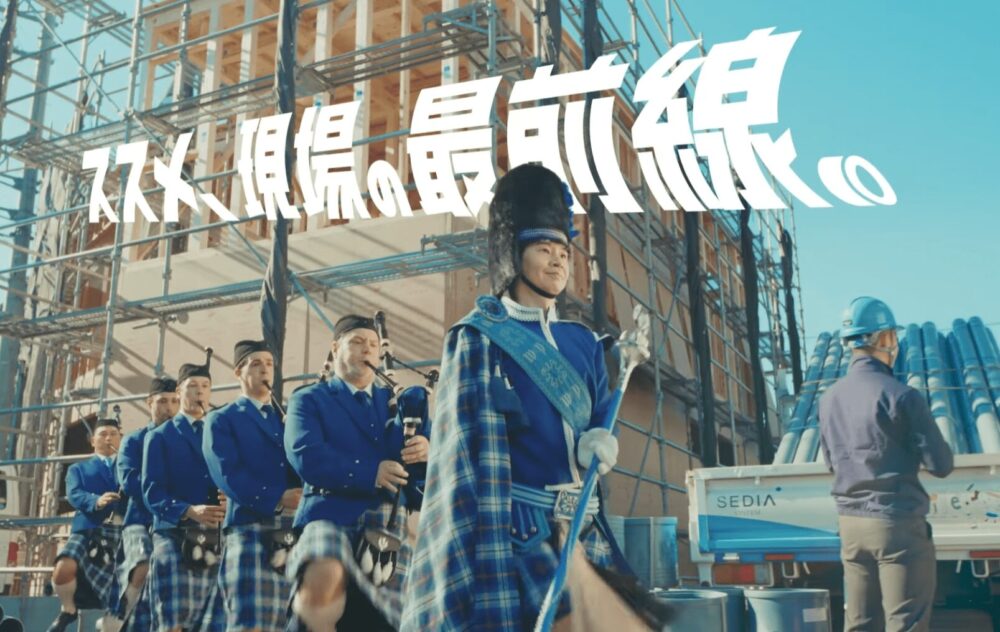 そこに映り込むのは、いつもの営業所でもフォークリフトの音が響く工事現場でもなく、バグパイパーの衣装に身を包んだ人気お笑いコンビ・オードリーのおふたり。若林正恭さんと春日俊彰さんが、まるで行進する楽隊のように、笑顔とユーモアを胸に現場を進んでいく。視聴者は思わず引き込まれ、肩の力を軽くして立ち止まることになるだろう。