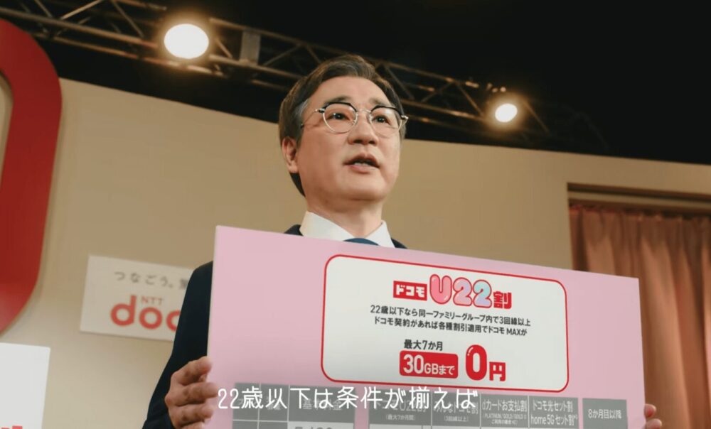 画面の中心となるのは、22歳以下を対象とした割引サービス「ドコモU22割」。家族のコミュニケーションやスマホの使い方を見つめ直しながら、親世代と若者が一緒にプランを考えるきっかけを提示する内容になっています。