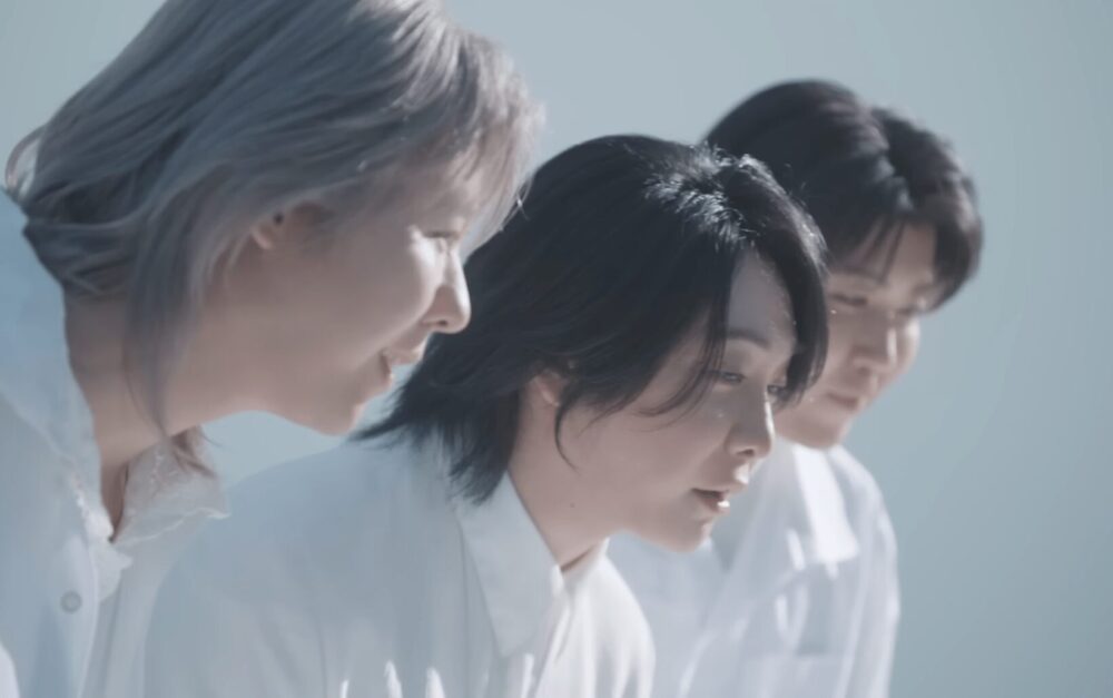 白い光に包まれた空間で、ロックバンドMrs. GREEN APPLEの3人と浜辺美波さんが向き合うのは、自分の肌。