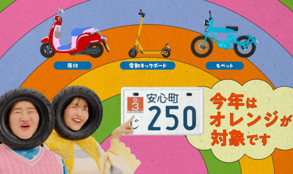 一般社団法人日本損害保険協会が2026年2月26日から公開した新WEB CMシリーズ「自賠責保険 罰則あるから、はいりーヤ!今すぐチェックしときーヤ!」では、お笑いコンビ・ガンバレルーヤ(よしこさん・まひるさん)を広報キャラクターに起用。原付・電動キックボード・モペットなどの運転者に向けて、義務である自賠責保険の加入・更新の重要性を訴求している。特に「罰則」篇では更新を怠ると最大50万円以下の罰金が課されるという現実を、3兄弟キャラクター“ぜっタイヤ!3兄弟”とのコミカルなやり取りで分かりやすく伝える。また「ステッカーチェック」篇では、更新期限を示すステッカーの色(今年はオレンジ)をすぐに確認することの大切さを強調しており、誰でもすぐに実践できる行動喚起がなされている。