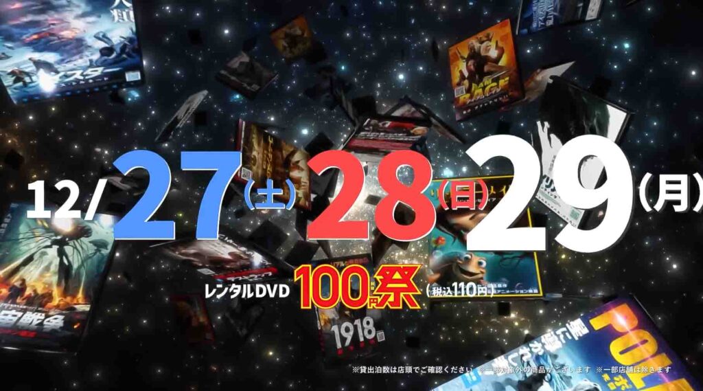 ゲオで開催される 年末恒例の レンタルDVD 100円(税込110円)キャンペーン。期間中は多くの作品が格安でレンタル可能です。