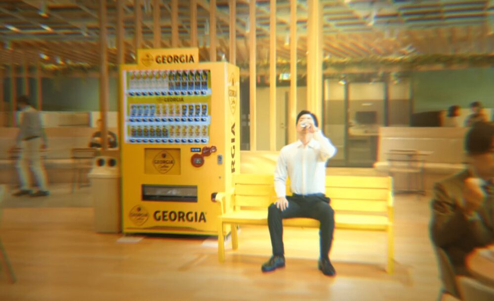 • 仕事の合間に自販機でジョージアを飲み、リフレッシュする姿を描く