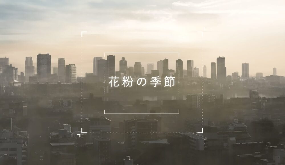 しかしスキンケアを使うことで、花粉やちりなどの微粒子から肌が守られる安心感が表現され、表情が明るく変わっていく様子が描かれています。