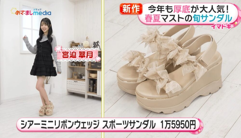 2026年4月22日放送のフジテレビ「めざましテレビ」内コーナー「イマドキ」では、宮迫翠月さんが「今年も厚底が大人気!春夏マストの旬サンダル」をテーマに、最新トレンドのサンダルを紹介しました。