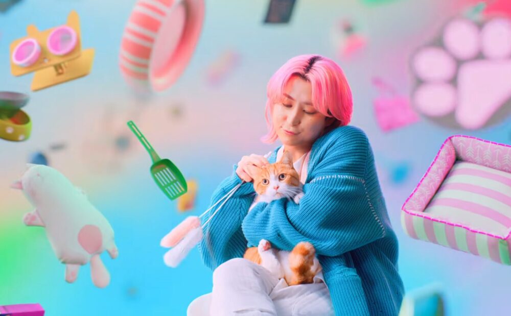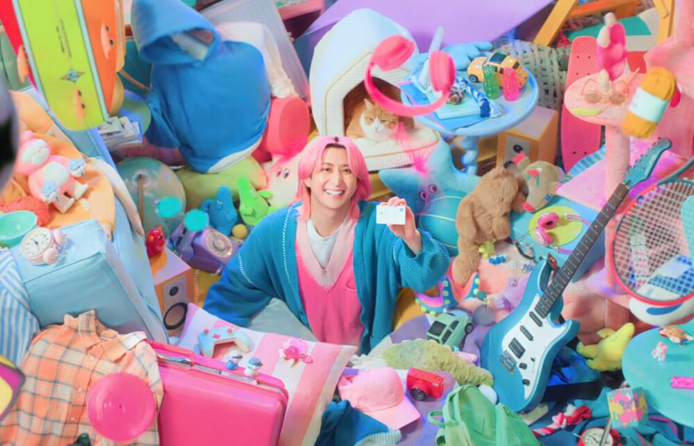 推しグッズやファッション、猫など、自分の好きなものに囲まれた空間の中で「好きを楽しむ。メルカード」というメッセージを表現している。