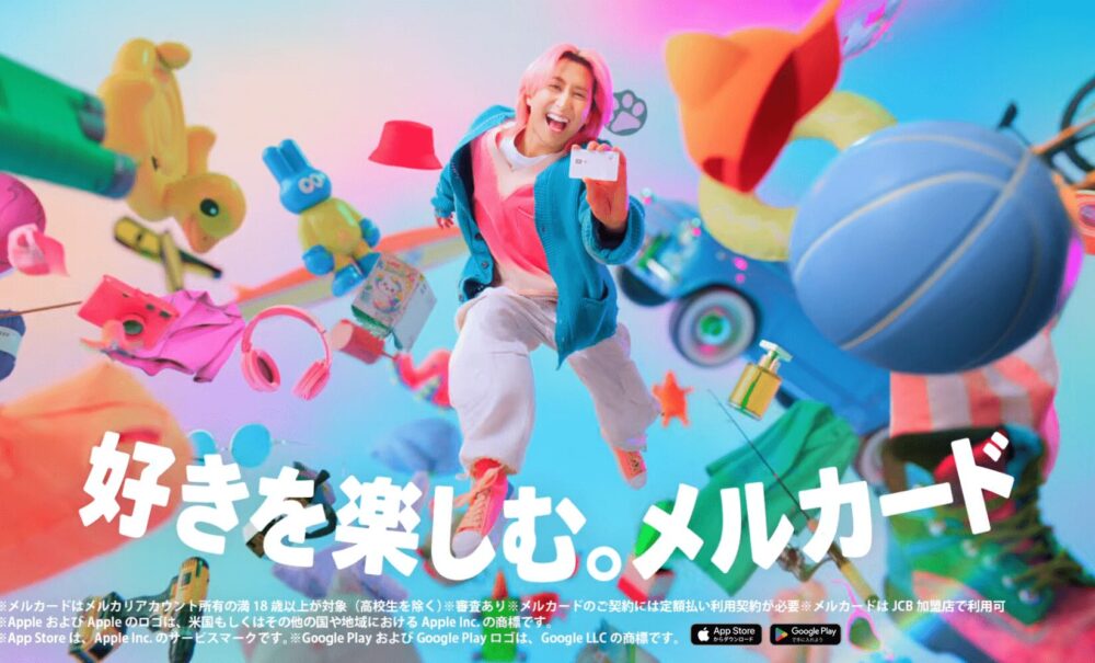 「好きを楽しむ。メルカード」というメッセージが軽やかに描かれています。