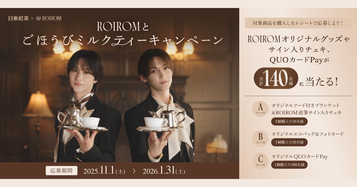 - 「ROIROMとごほうびミルクティーキャンペーン」実施中。対象商品購入レシートで応募。