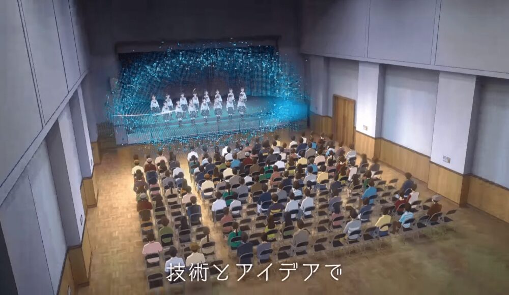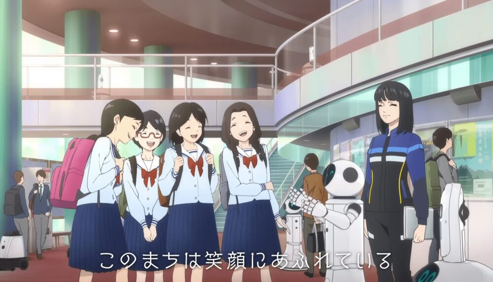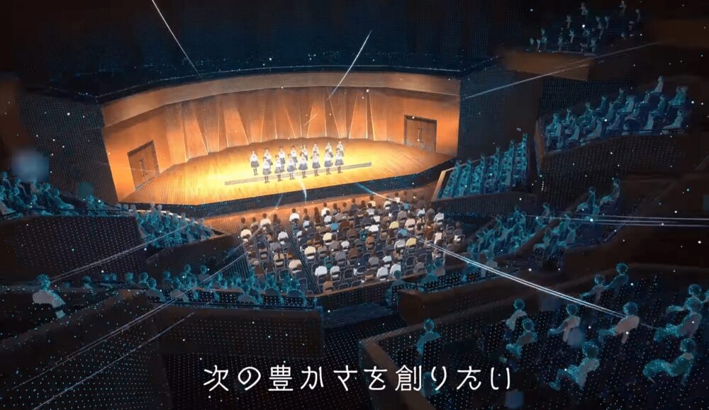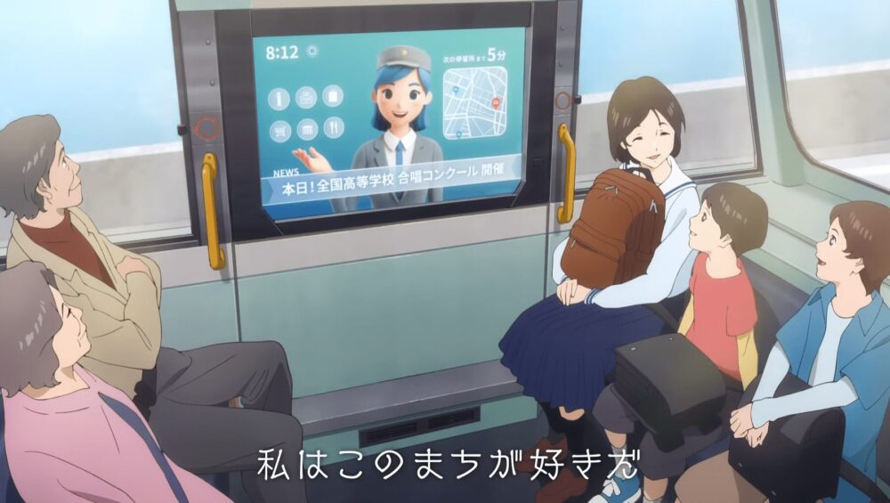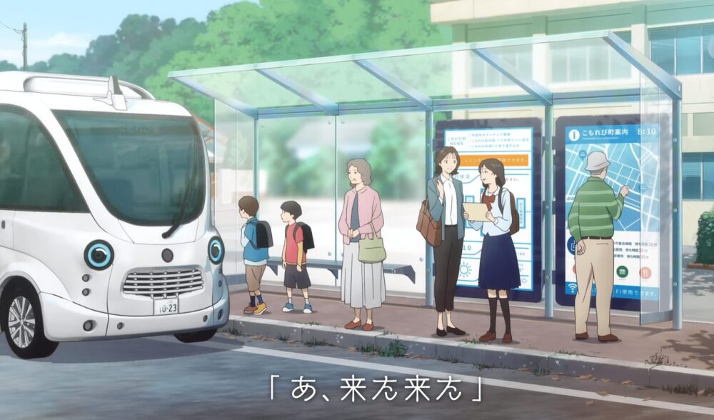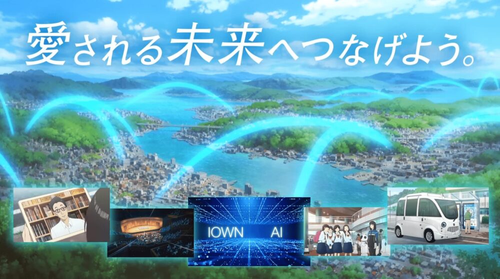 作中では、自動運転EVバスやロボット、IOWNによる空間伝送などの先進技術が自然に生活へ溶け込む様子を通じて、技術が人と人、地域と地域をつなぎ、未来へと想いを受け渡していく姿を表現しています。