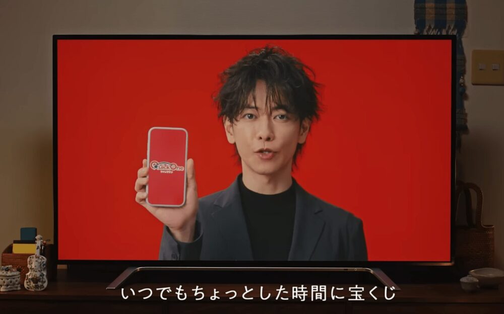 テレビの中から登場した佐藤健さんが、宝くじの新しい楽しみ方「クイックワン」を紹介。