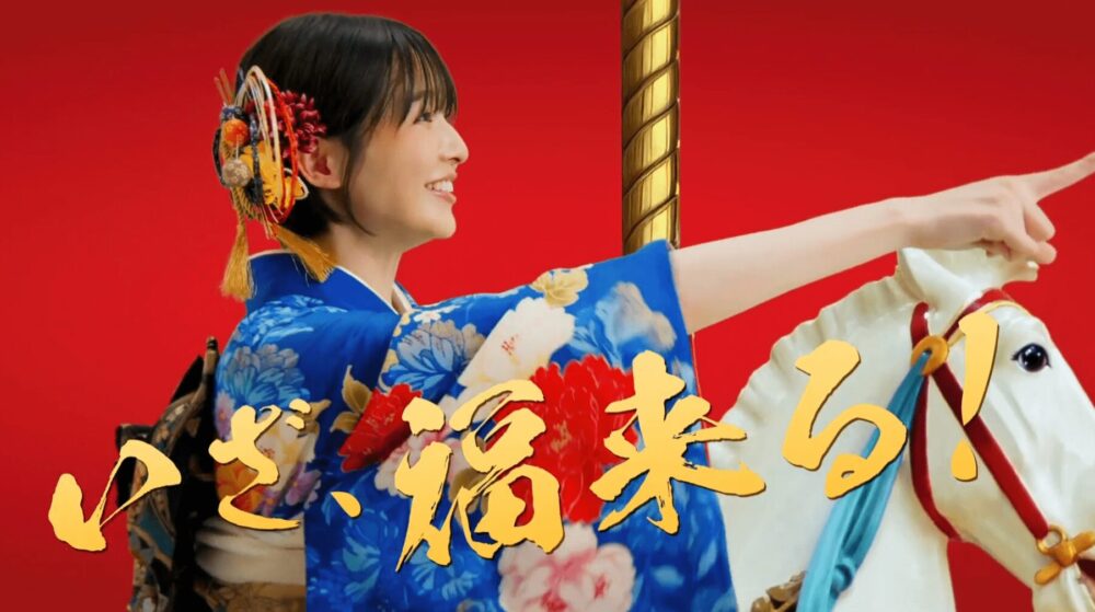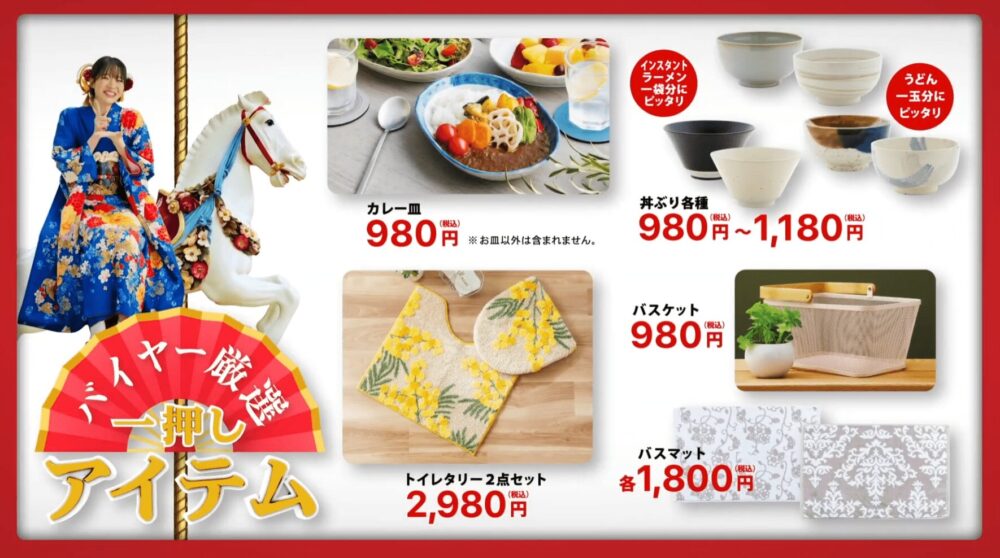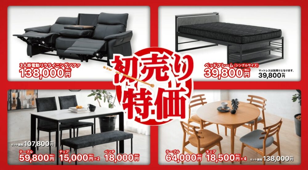 振袖姿の小鳥遊さんが笑顔で家具や雑貨に囲まれながら、新春のお得なセールを紹介するシーン。新しい年の生活への高揚感が感じられる。