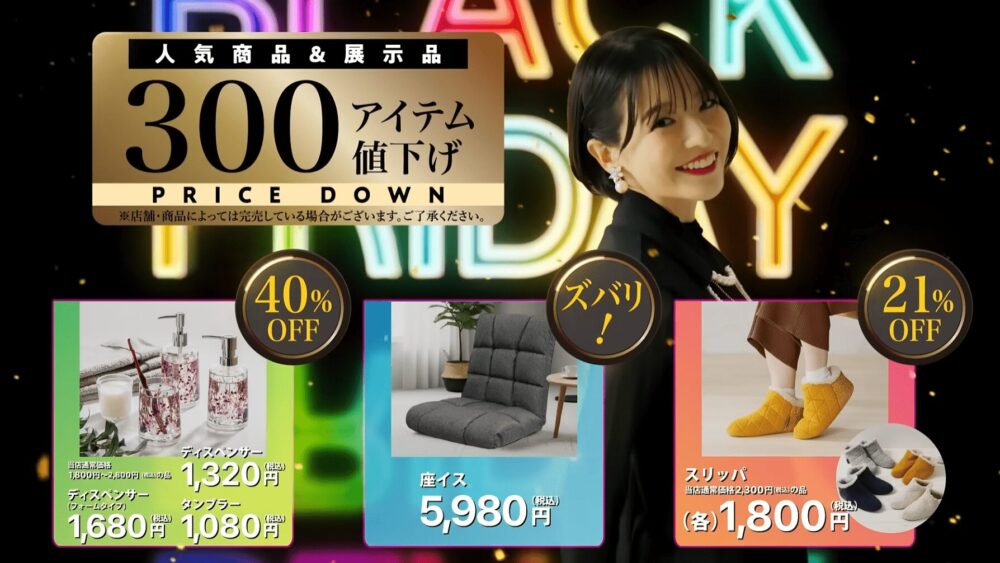 ブラックフライデーの到来を告げる、少し特別な黒の空気。その中を軽やかに歩くのが、今回の東京インテリア「BLACK FRIDAY」CMに出演する女優・小鳥遊可奈さんです。落ち着いた色味の店内に、小鳥遊さんの柔らかな表情が重なることで、“お得”と“上質”が同時に立ち上がる映像に仕上がっています。大物家具から雑貨まで、この期間だけの特別感をスマートに伝えてくれる、東京インテリアらしいスタイリッシュなセールCMです。