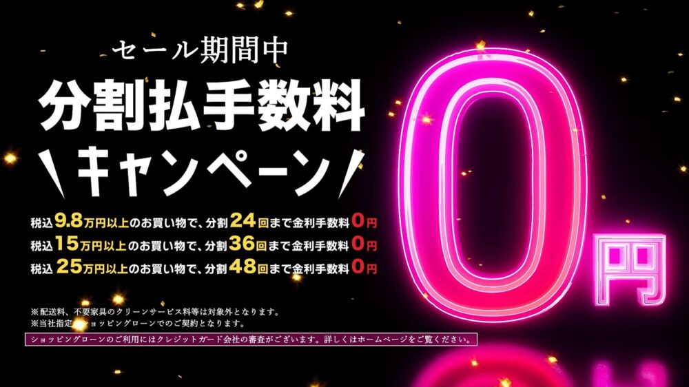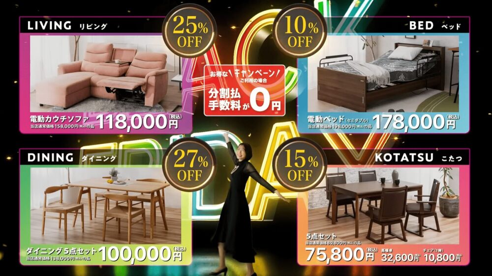 ・黒を基調にした画面構成と、テンポよく変わるカットで“特別セールのワクワク”を表現。