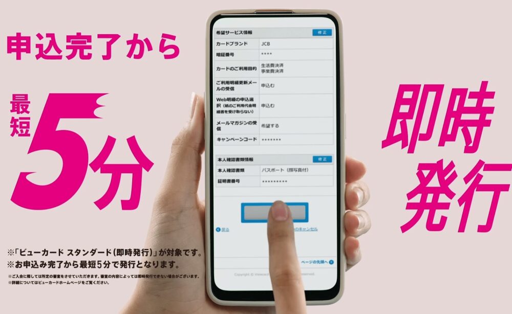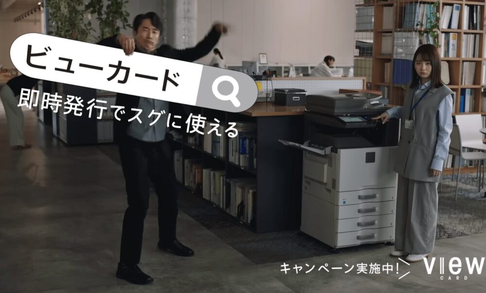 眞島秀和さんと山田杏奈さんが出演するビューカードのCM「即時発行篇」は、カード申し込み後、最短5分で利用開始できる利便性を訴求した内容です。