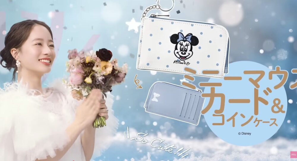 • 画面のすみに「ミニーマウス カード&コインケース」のビジュアルが残り、